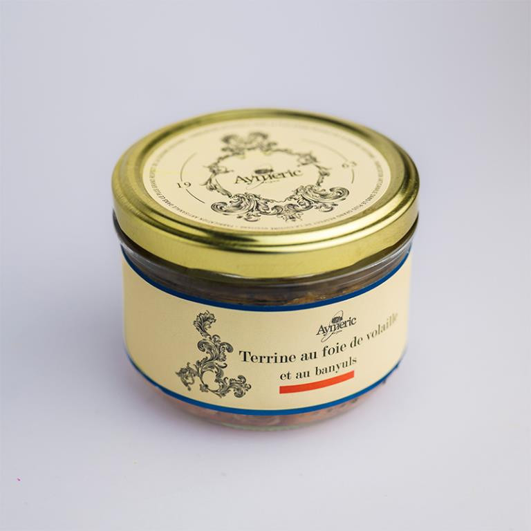 Une terrine de foie de volaille accompagné de Banyuls. Le Banyuls est un vin doux naturel d’origine contrôlée produit dans le Sud de la France, dans le département des Pyrénées-Orientales. La saveur du Banyuls embelli la finesse des foies de volaille. Poids: 190g