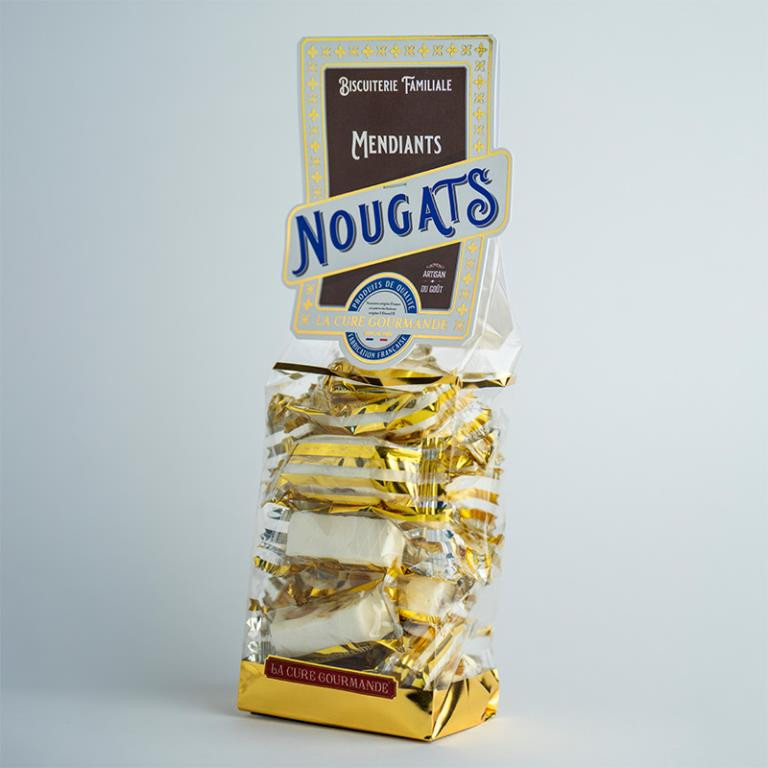 Ingrédients : sucre, sirop de glucose, AMANDES, miel, NOISETTES (3%), raisins secs (3%) (raisins, huile végétale), PISTACHES (3%), pain azyme (fécule de pomme de terre, eau, huile de tournesol), écorces d'oranges contes (écorces d'orange (52,4%), saccharose, sirop de glucose-fructose, dextrose), blanc d'OEUF, arôme poudre vanille. Traces éventuelles de SOJA, LAIT, SESAME, SULFITES et autres FRUITS A COQUE.