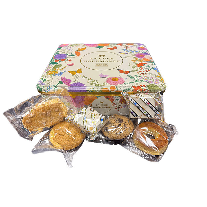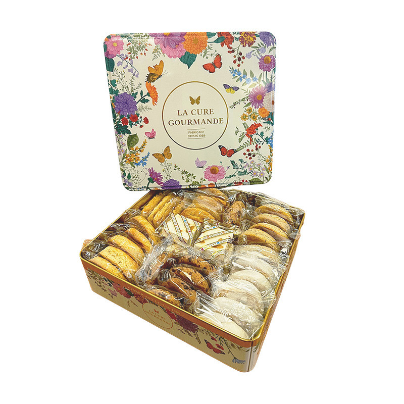 Ingrédients: Nougats AMANDES (Sucre, sirop de glucose, AMANDES (15%), miel, pain azyme (fécule de pomme de terre, eau, huile de tournesol), blanc d'OEUF, arôme poudre vanille), rousquilles (farine de BLE, sucre, huile de colza, OEUFS, miel, jaunes d'OEUFS, sirop de glucose, blancs d'OEUFS, jus de citron, poudre à lever : bicarbonate d'ammonium, sel, arôme naturel de citron et arôme naturel d'anis), couronne abricot (farine de BLE, sucre, huile de colza, OEUFS, purée d'abricot variété Rouge du Roussillon AOP (8,3%), arôme naturel d'abricot, poudres à lever : carbonates d'ammonium- diphosphates disodique - carbonate de sodium (dont BLE), sel), couronne anis (farine de BLE, sucre, OEUFS, huile de colza, graines d'anis (3,5%), LAIT écrémé, poudres à lever : carbonates d'ammonium - diphosphates - carbonates de sodium (BLE), sel), cookie chocolat NOISETTES (farine de BLE (31%), pépites de chocolat noir (27%) (cacao 55% minimum) (pâte de cacao, sucre, beurre de cacao, émulsifiant : lécithine de tournesol, arôme vanille), sucre, BEURRE, NOISETTES (8%), OEUFS, LAIT écrémé, poudre à lever : bicarbonate d'ammonium, sel, vanilline)), croquantines (farine de BLE, sucre, AMANDES (15%), OEUFS, huile de colza, jaune d'OEUF, poudre à lever : bicarbonate d'ammonium, vanilline, arôme naturel de citron, sel), croquants amandes (farine de BLE, sucre, éclats d'AMANDES (15%), OEUFS, poudre à lever : bicarbonate d'ammonium, arôme naturel de citron, vanilline). Traces éventuelles d'autres FRUITS A COQUES, SOJA, SESAME, SULFITES.