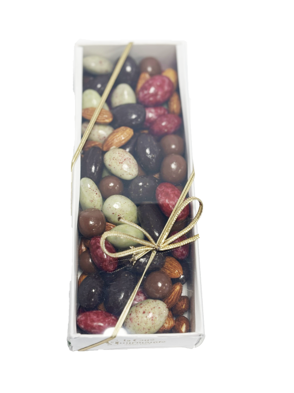 Ingrédients : AMANDES caramélisées 34% (AMANDES 96%, sucre, sirop de glucose, miel), sucre, masse de cacao, NOISETTES caramélisées 12% (NOISETTES 96%, sucre, sirop de glucose, miel), beurre de cacao, poudre de LAIT entier, agents d'enrobage (shellac, gomme arabique), émulsifiant : lécithines (SOJA), sirop de glucose, arôme naturel de vanille, amidon, ingrédients naturellement colorant (concentré de carthame et spiruline), colorants : E100, E133, E163. Traces éventuelles d'OEUFS, de GLUTEN, SESAME et d'autres FRUITS A COQUE.