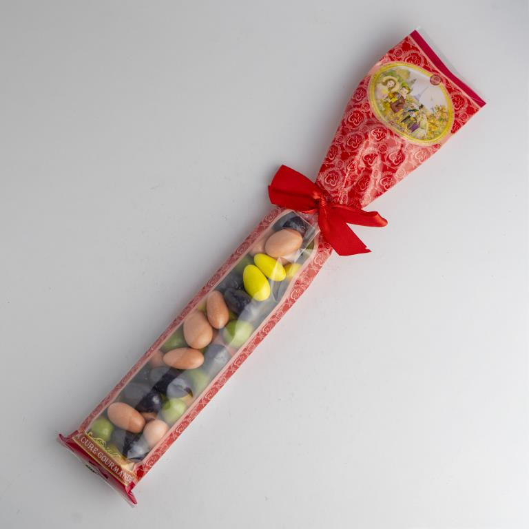 Ingrédients : chocolat noir (pâte de cacao, sucre, beurre de cacao, émulsifiant : lécithine (SOJA)), AMANDE, sucre, beurre de cacao, poudre de LAIT entier, émulsifiant : lécithine (SOJA), épaississant : gomme arabique, amidon de riz, arôme naturel de vanille avec autres arômes naturels, colorants : extrait de paprika, chlorophylles cuivriques, extrait naturel de carotte, concentré (carotte, hibiscus), curcumine, rouge de betterave, agents d'enrobage : cire de carnauba. Traces éventuelles d'autres FRUITS A COQUE.